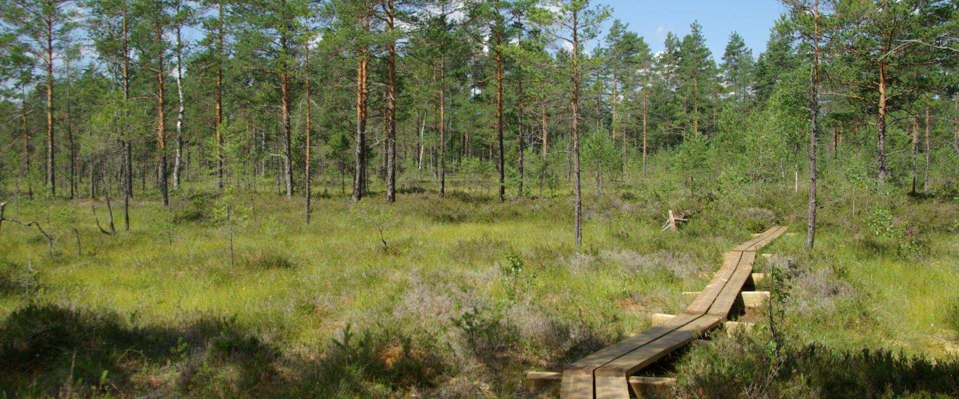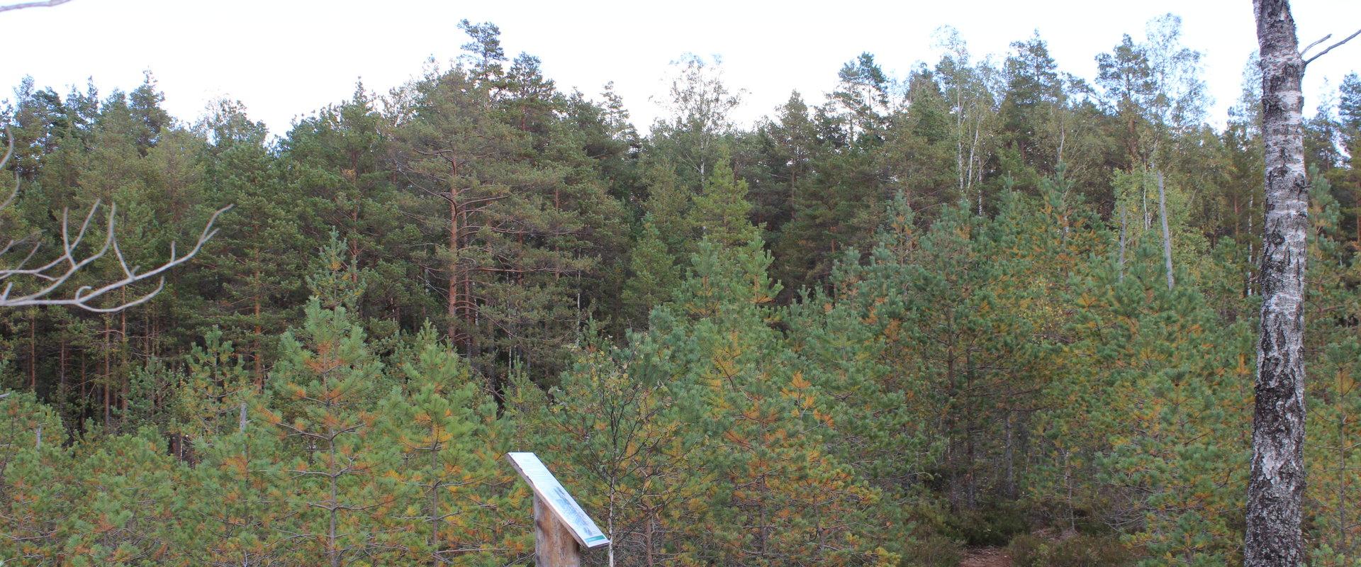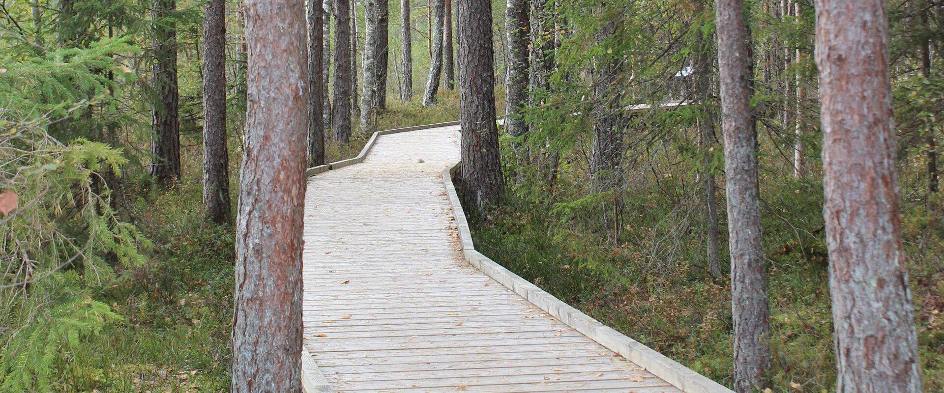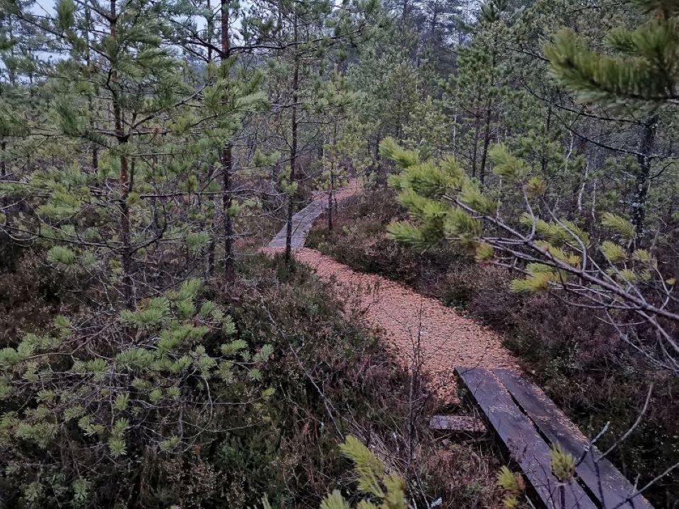 Auf diesem Rundwanderweg lernen Sie die Hochmoorlandschaft und den benachbarten Wald im trockengelegten Moor kennen. Es handelt sich hier um ein Torfmoor mit den alten Löchern vom Torfstechen sowie Spuren von Tieren und Vögeln. Im Sommer lassen sich auf dem längeren Abschnitt auch Kreuzottern beobachten. Neben dem Weg finden sich Blaubeeren, Moosbeeren, Moltebeeren und andere im Moore wachsende Arten.