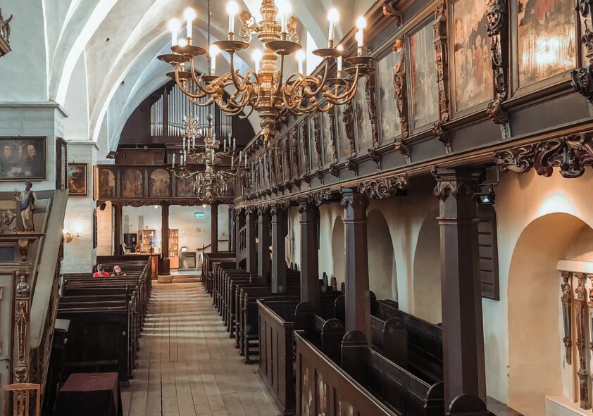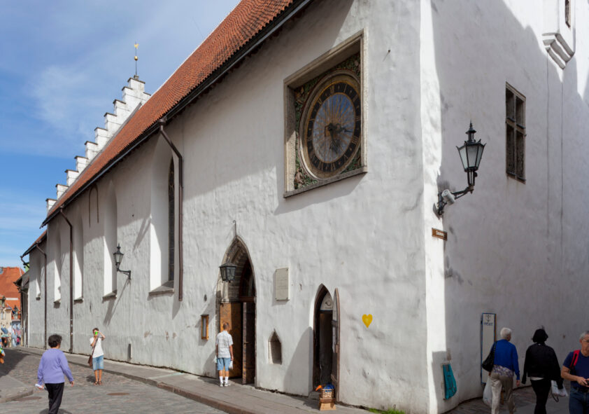 Die im 14. Jahrhundert erbaute strahlend weiße Heilig-Geist-Kirche mit einem Interieur aus Holz und einem achteckigen Turm ist einer der ältesten und prächtigsten Bauten in Tallinn. Bevor man in die Kirche eintritt, lohnt es sich, einen Blick auf die Fassade zu werfen, an der eine Uhr aus dem 17. Jahrhundert bis heute die Zeit misst. Zu den Kostbarkeiten der Kirche gehören der einzigartige Schrankaltar von Berndt Notke aus dem 15. Jahrhundert und die Kanzel aus dem Jahre 1597.