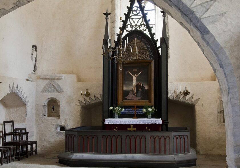 Die dem Heiligen Kreuz Christi gewidmete 700-jährige Kirche mit massiven Mauern war ursprünglich dem Kloster Padise unterstellt. Der seltene Halbrundturm wurde gebaut, als der ursprüngliche Rundturm im 17. Jahrhundert einstürzte. Der schwerfällige Pfeiler und der niedrige Siegesbogen verleihen der Kirche, die zu den eigenartigsten und ältesten auf dem Festland Estlands gehört, einen zusätzlich archaischen Charme.