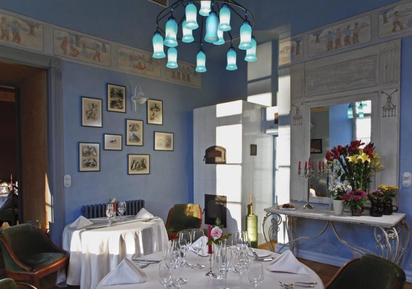 Der Festsaal mit vertraulichem Ambiente und das Zimmer der Baronin bieten zusammen Platz für 50 Gäste. Bei schönem Wetter können die Gäste leckere Gerichte auf der Sommerterrasse genießen, von wo aus sich ein herrlicher Blick auf den Gutshofpark eröffnet.