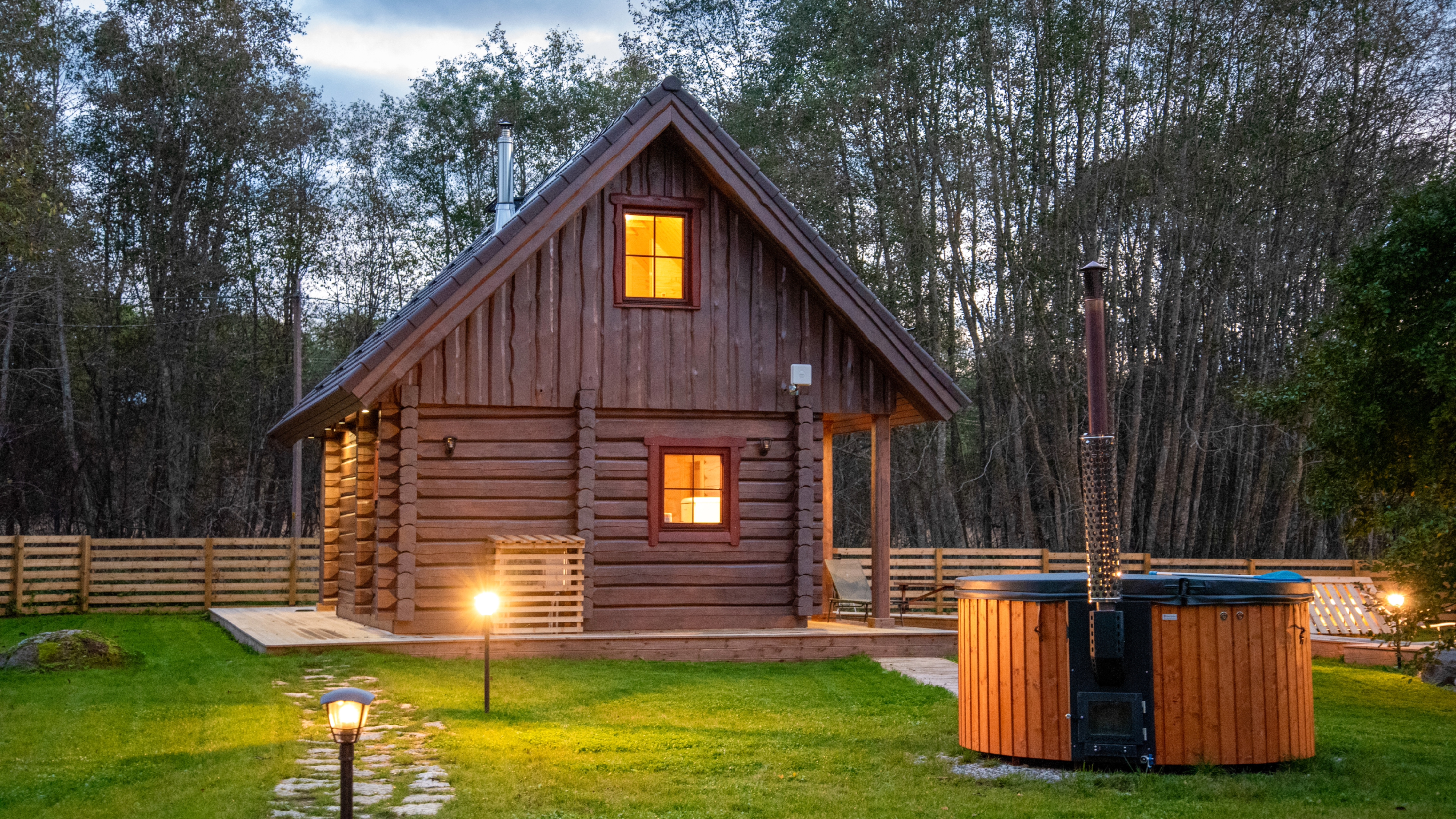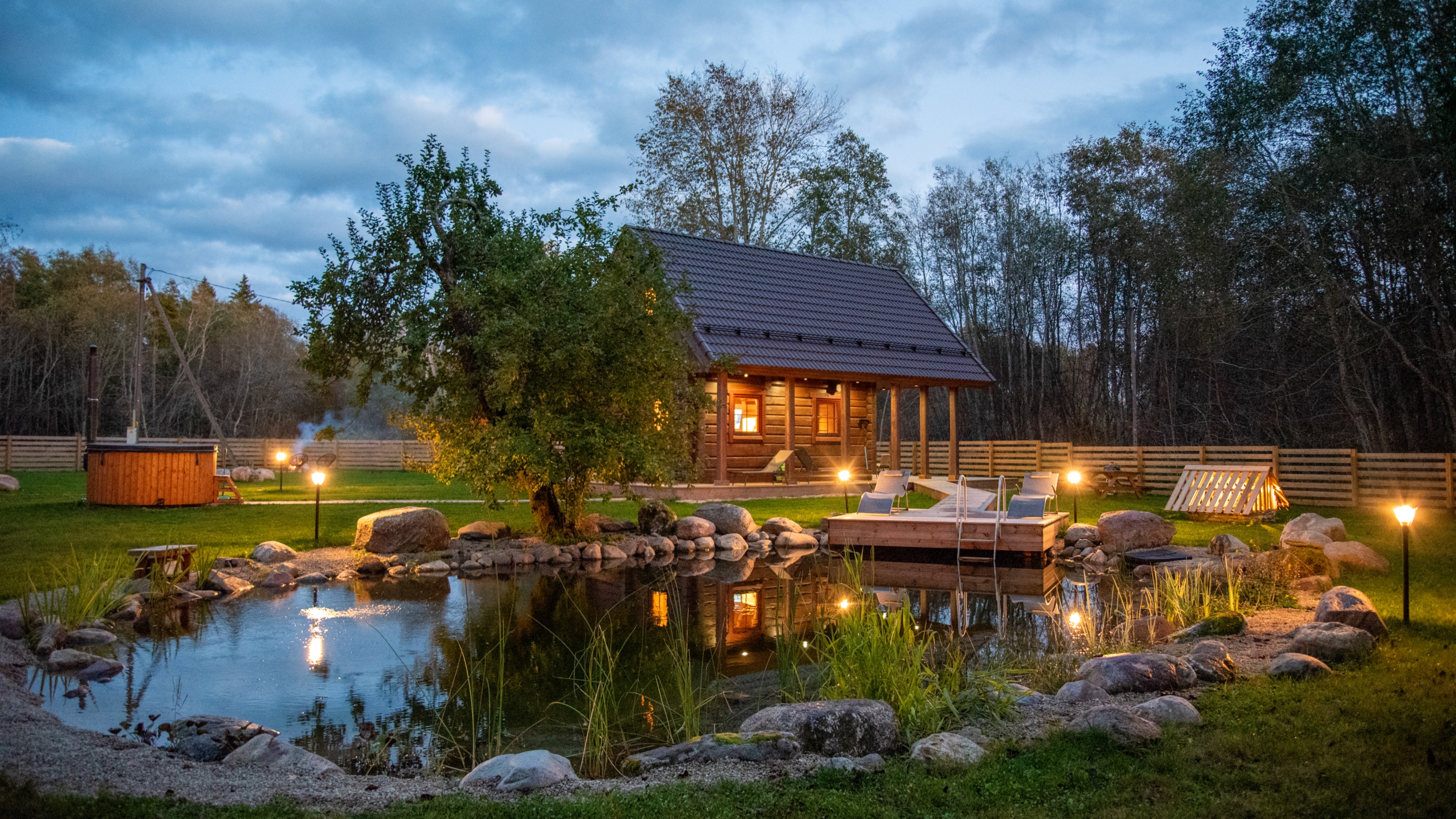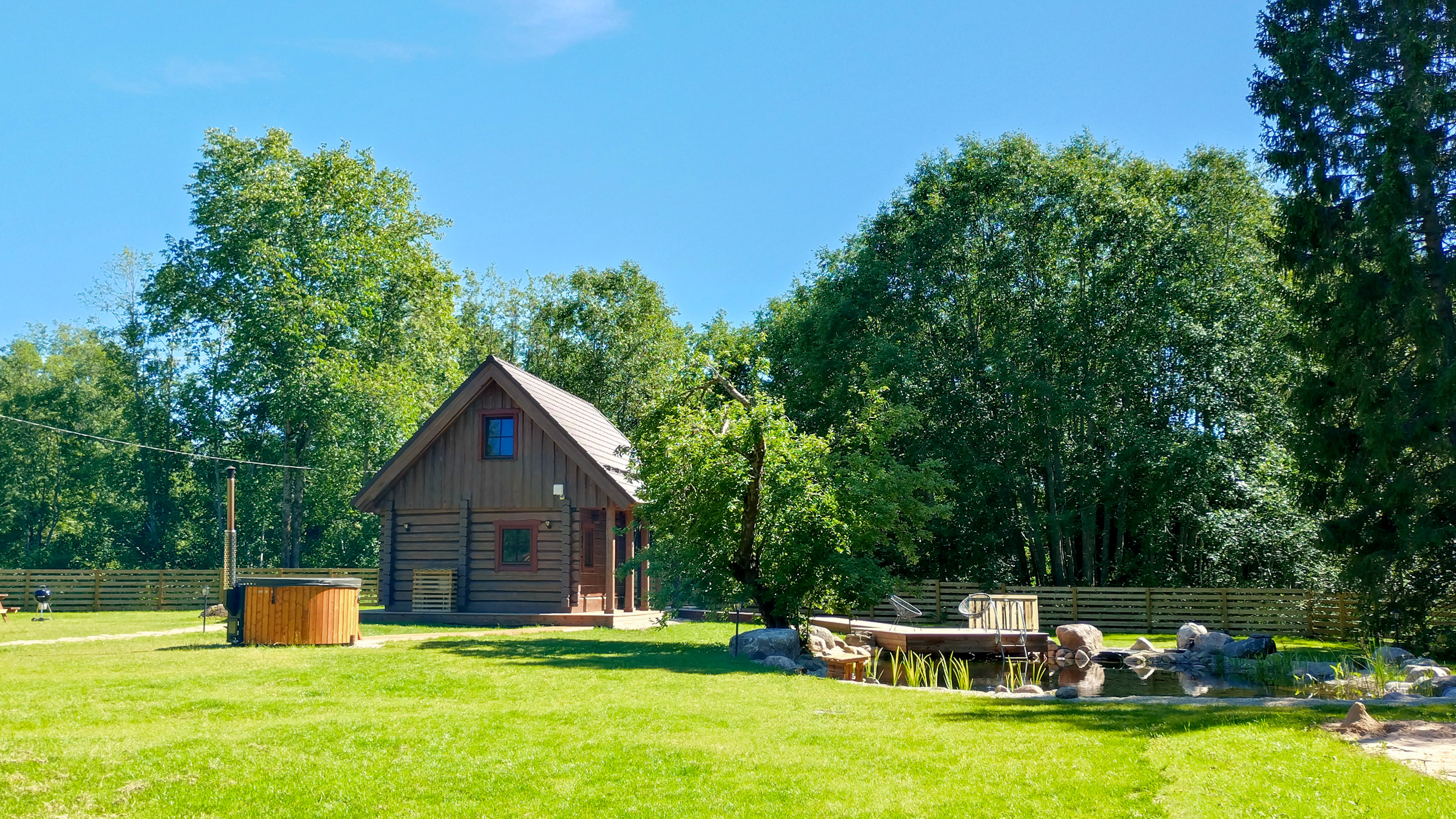 Our sauna house is enhanced by a year-round swimming pond with filtered water, a hot tub with lights and massage functions, and a wood-fired sauna. Thanks to the fence, pets also feel safe with us. It is possible to request nature hikes with a local guide.