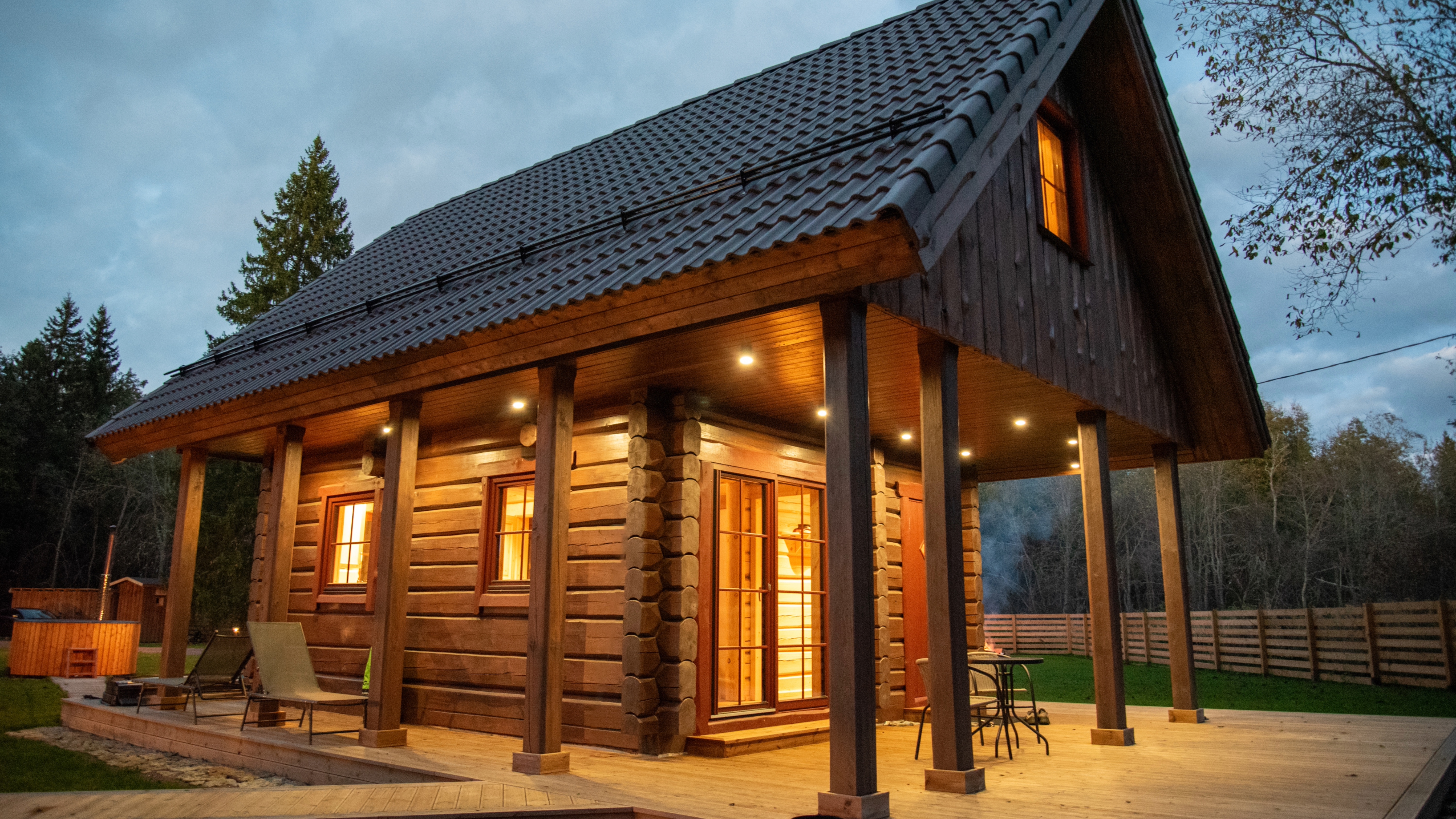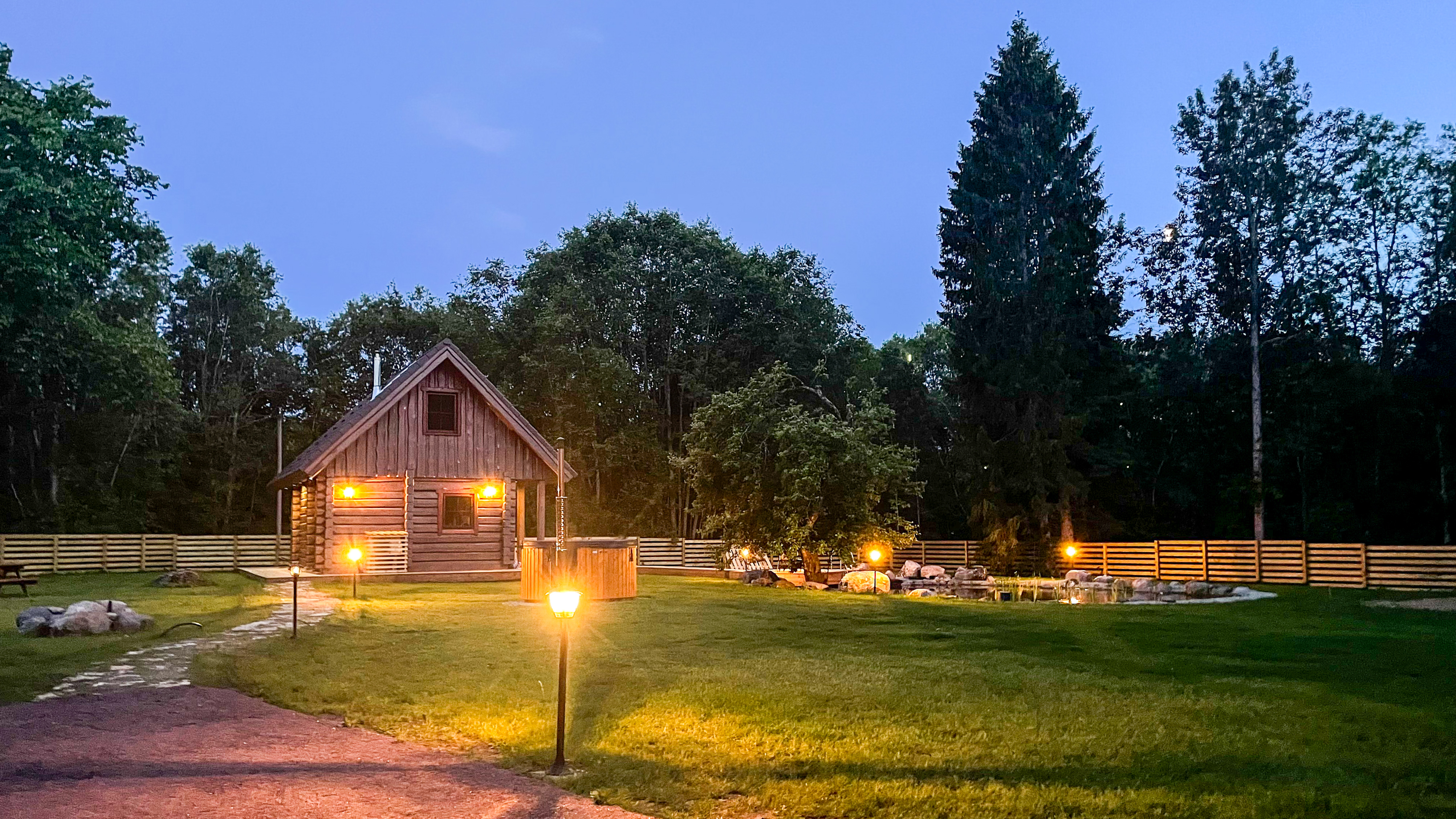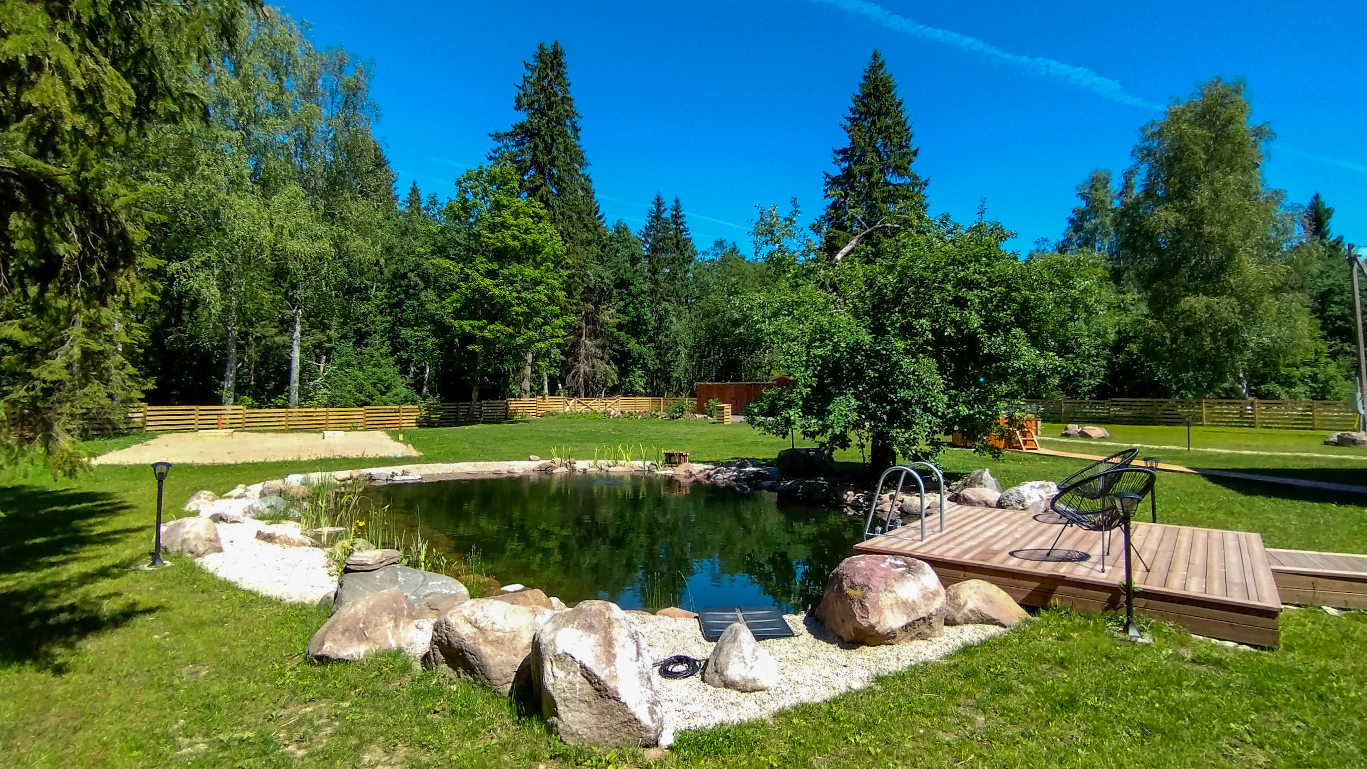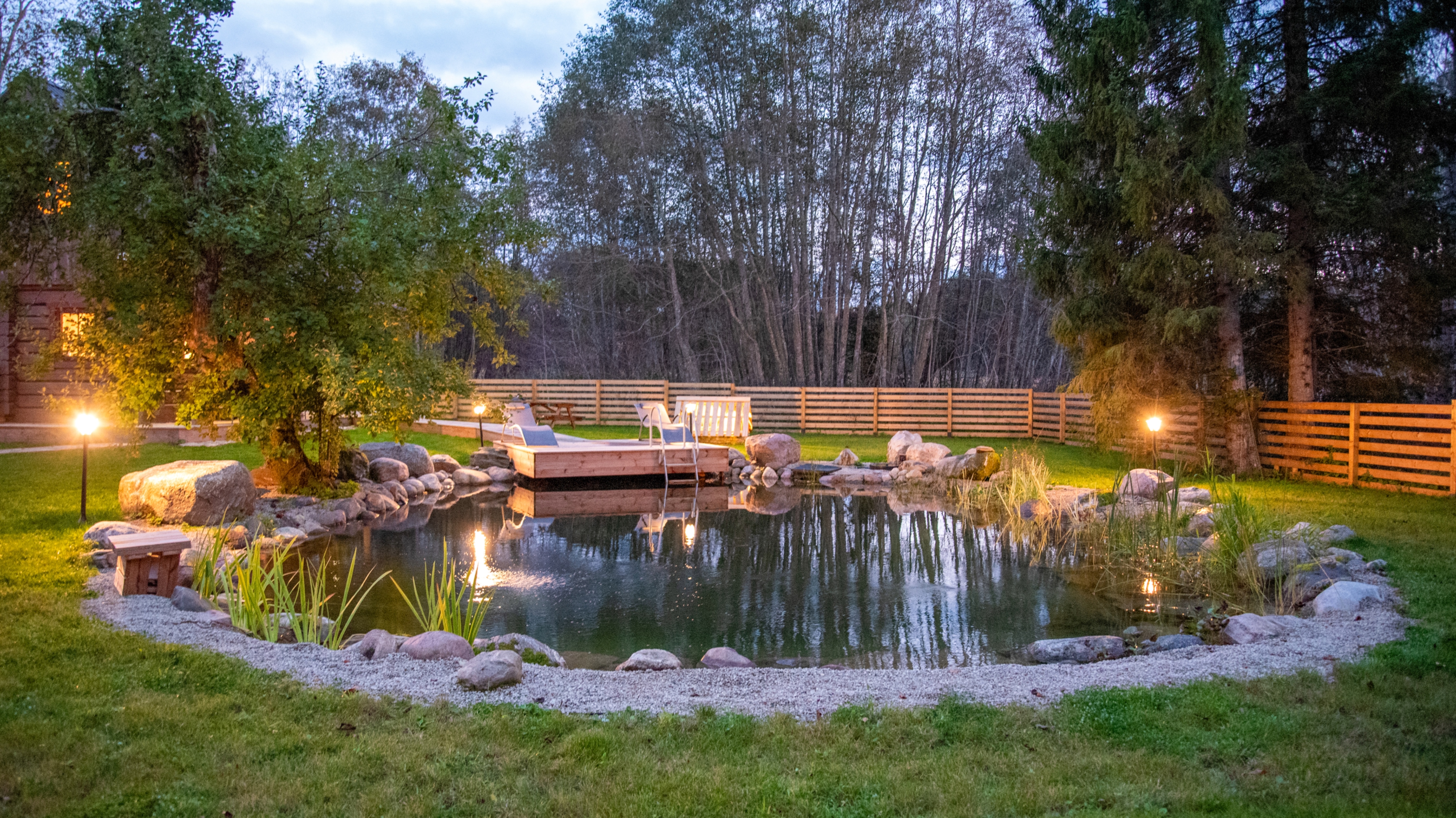 Our sauna house is enhanced by a year-round swimming pond with filtered water, a hot tub with lights and massage functions, and a wood-fired sauna. Thanks to the fence, pets also feel safe with us. It is possible to request nature hikes with a local guide.