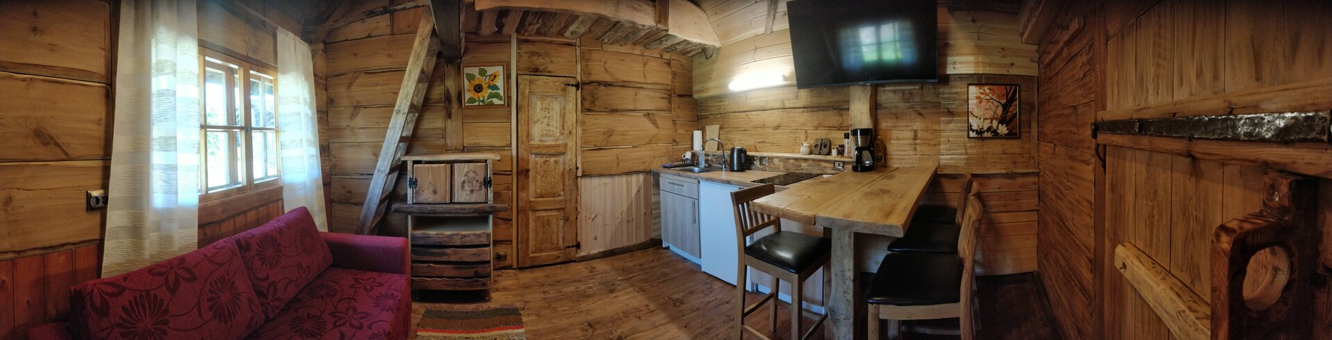 The house’s special features include a narrow ladder to the second floor, a low, old barn door, and a 60 cm wide sauna door. The house got its name from a horseshoe found during the renovation. The historic mortise lock and charming wooden details have been preserved, creating a special atmosphere. It’s the perfect location for a romantic getaway, a relaxing evening in the sauna, or a peaceful escape from city life.
