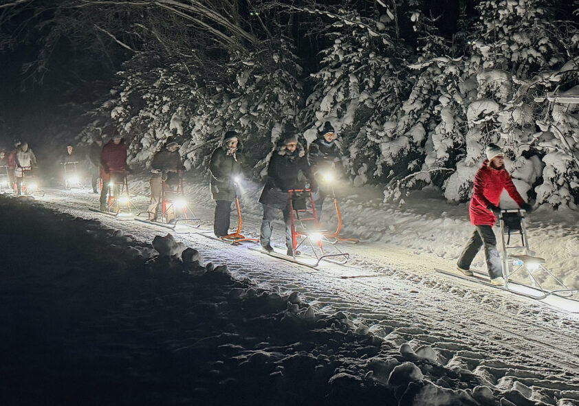Vakara krēslā mēs iedegsim maigās LED gaismas skrejragavām, kas vienmērīgi apgaismo gan ceļu, gan apkārtni, neapžilbinot pavadoņus. Mēs pārvietojamies mierīgā tempā ar pauzēm, lai pamanītu ziemas dabas detaļas: sniega gaismas spēles, apsarmojušās egles un sarmā mirdzošo gaismu. Pārgājiens ir piemērots arī iesācējiem un dažāda vecuma dalībniekiem.
