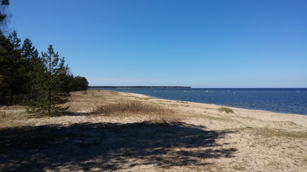 Stāvot pludmalē, Tirisalu (Türisalu) klints atrodas labajā pusē, un Lohusalu pussala ir redzama tālumā kreisajā pusē.