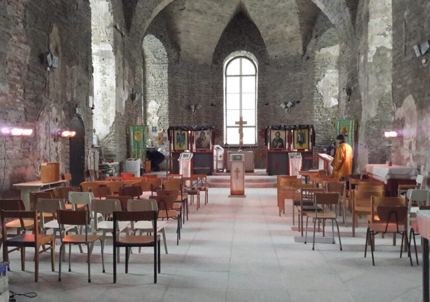 Nõukogude okupatsiooni ajal mahavõetud kiriku kellatorn ja sibulpeaga altarikuppel on endiselt taastamata.
