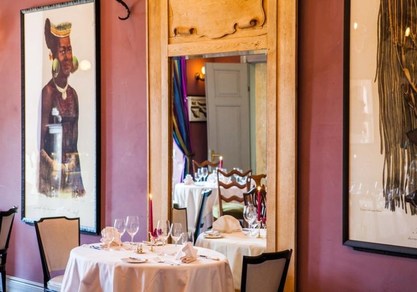 Der Festsaal mit vertraulichem Ambiente und das Zimmer der Baronin bieten zusammen Platz für 50 Gäste. Bei schönem Wetter können die Gäste leckere Gerichte auf der Sommerterrasse genießen, von wo aus sich ein herrlicher Blick auf den Gutshofpark eröffnet.