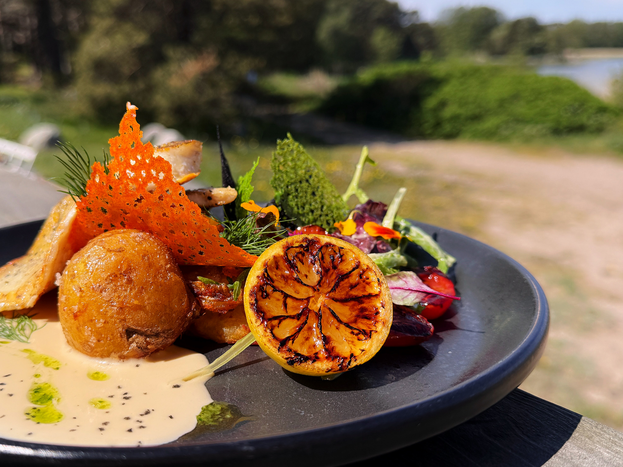 The interior design of the restaurant is inspired by Nordic simplicity and sea tones. The menu offers a wide range of dishes, including seafood, local fish, classic favorites, and vegetarian dishes. The restaurant is designed for the whole family, offering a play corner for children — pets are also welcome. Discos and concerts take place on weekends.