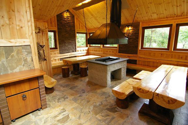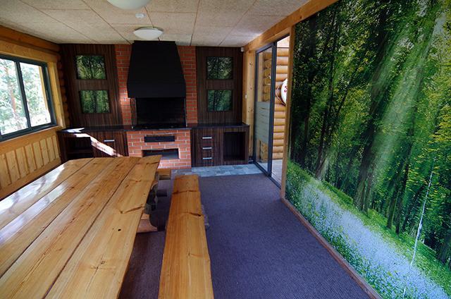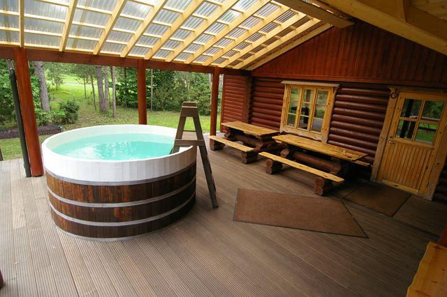 There are stone barbeque pits on the patio and large wooden vats placed in front of the sauna, in which water from an artesian well is constantly circulating through a filter. The area also includes sporting fields, children’s playgrounds and hiking trails.