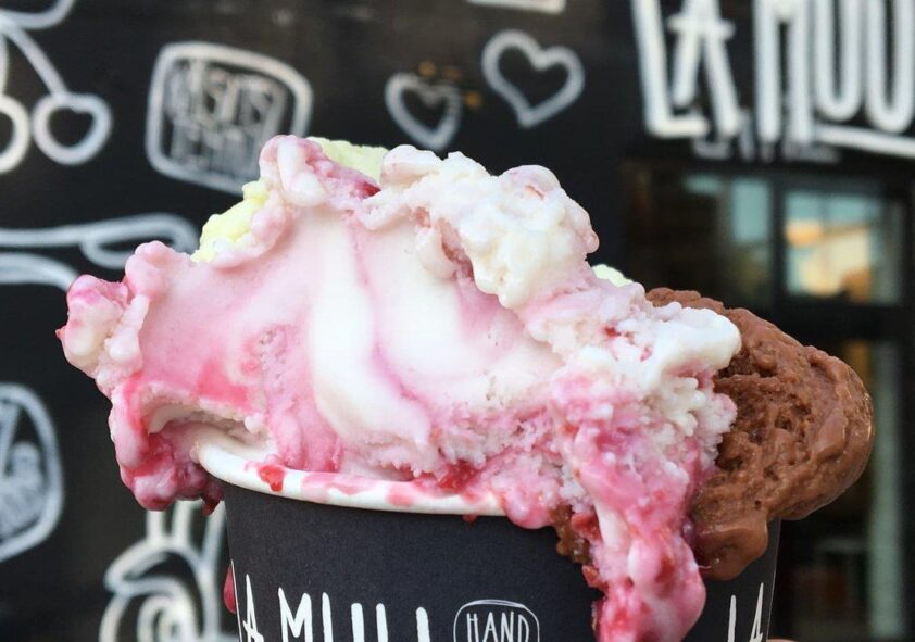 Ja tietysti sankari itse – luomujäätelö La Muu, joka valmistuu vain luomuraaka-aineista, on valmistettu perinteisellä italialaisella gelato-jäätelökoneella ja maistuu naurettavan hyvältä!