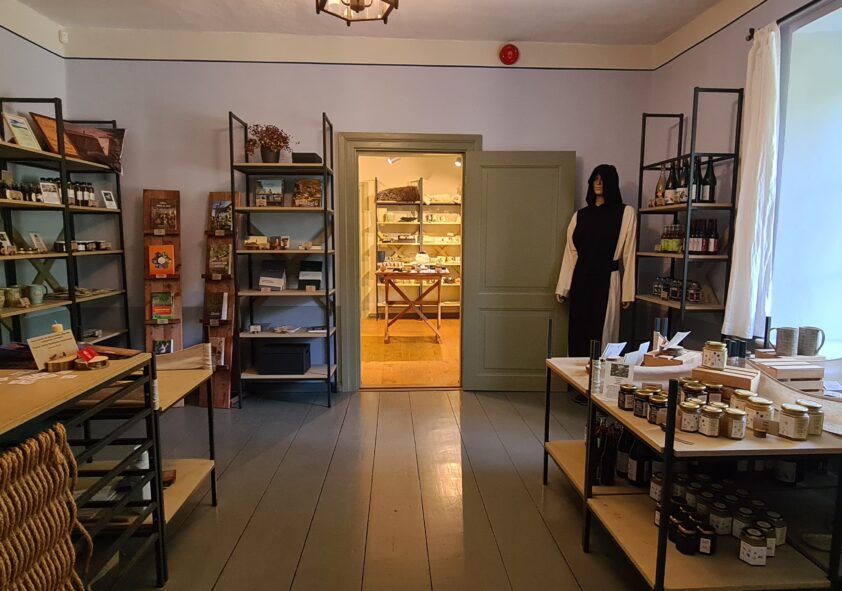 Valikust leiab kloostri meeneid ja piirkonnale omaseid tooteid angervaksasiirupist mõnusalt krussis karvaga lambanahkadeni. Ajaloo- ja aiasõpru ootab hea valik raamatuid, maiasmokki värske mesi ja kingiotsijaid kordumatu keraamika, autoriehted ja palju muud põnevat.