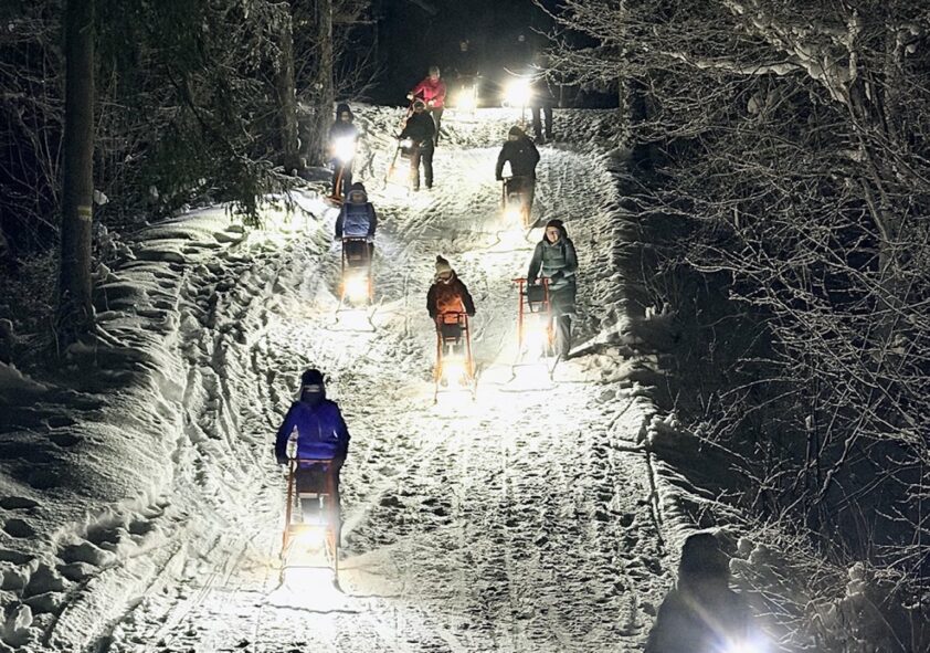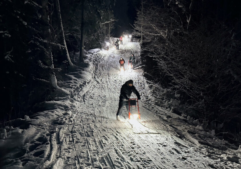 Vakara krēslā mēs iedegsim maigās LED gaismas skrejragavām, kas vienmērīgi apgaismo gan ceļu, gan apkārtni, neapžilbinot pavadoņus. Mēs pārvietojamies mierīgā tempā ar pauzēm, lai pamanītu ziemas dabas detaļas: sniega gaismas spēles, apsarmojušās egles un sarmā mirdzošo gaismu. Pārgājiens ir piemērots arī iesācējiem un dažāda vecuma dalībniekiem.