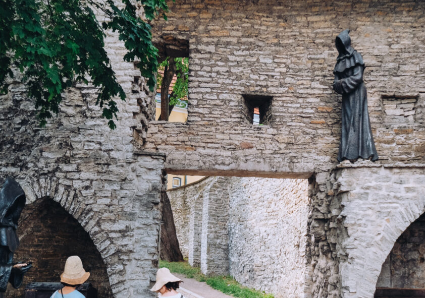 Kolme munga skulptuure aias täiendab valguslahendus ning infotahvel linnamüüril.