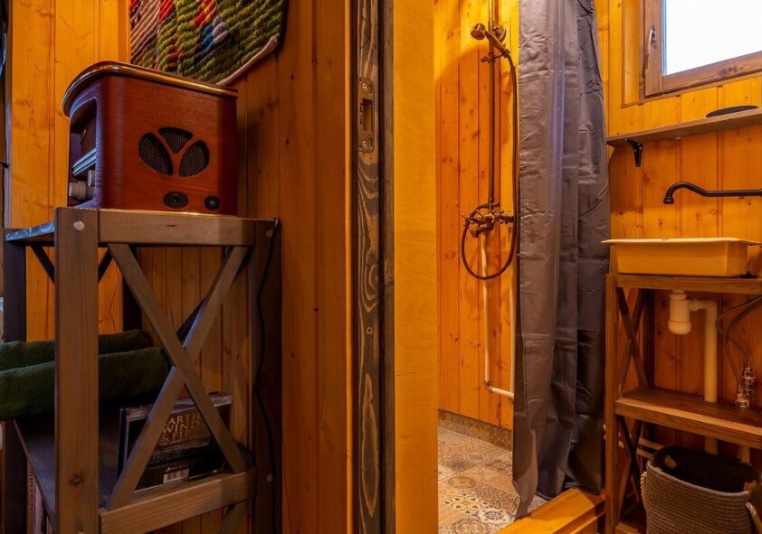 Majas on väike kööginurk, vannituba ning õdusa kaminaga magamis- ja lõõgastusala. Väljas ootab kasutamist kauni vaatega terrass. Majani jõudmiseks tuleb läbida 200 m käänulist pargiteed ja ületada rippsild.